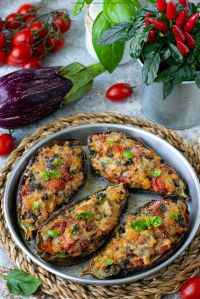 Farcisci ogni mezza melanzana con la crema di peperoni e ceci. Decora con foglie di basilico o prezzemolo fresco e un filo d’olio a crudo.