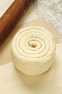 Stendi il panetto in un rettangolo lungo. Piega a portafoglio ovvero piega il lato inferiore verso il centro, poi quello superiore sopra il primo.