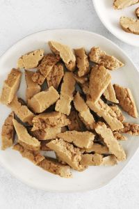 Taglia il seitan a pezzetti e mettilo in una ciotola capiente.