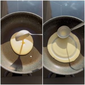 Ottenuto il risultato desiderato, scalda una padella antiaderente a fuoco medio e, se vuoi, ungi leggermente con un filo d’olio (oppure usa una spray antiaderente) per poi versare un mestolo di pastella al centro della padella calda. A questo punto inclina la padella in modo che la pastella si distribuisca uniformemente.