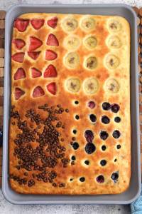 Non ti resta che distribuire sulla superficie la frutta o le gocce di cioccolato, premendole appena nell’impasto.